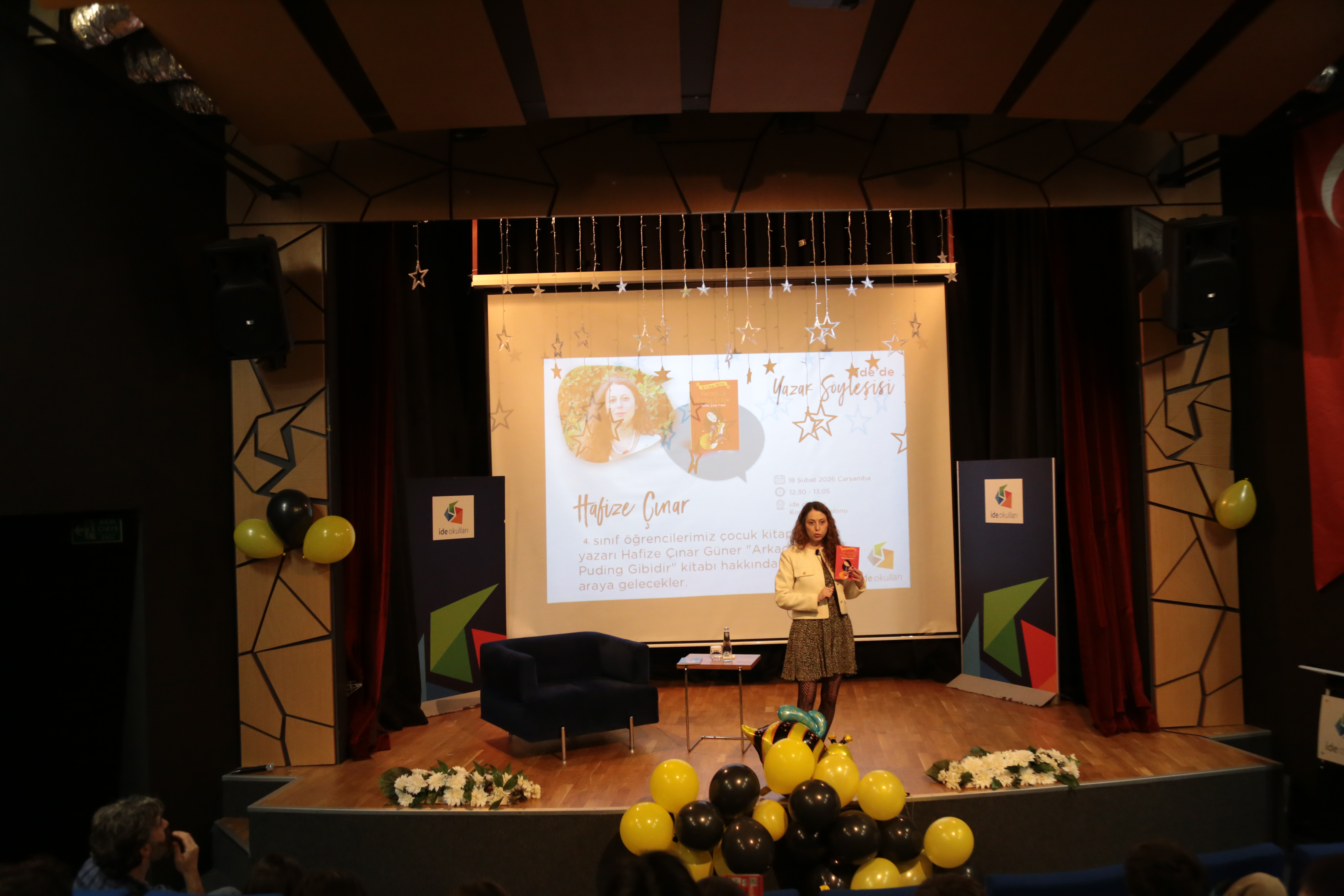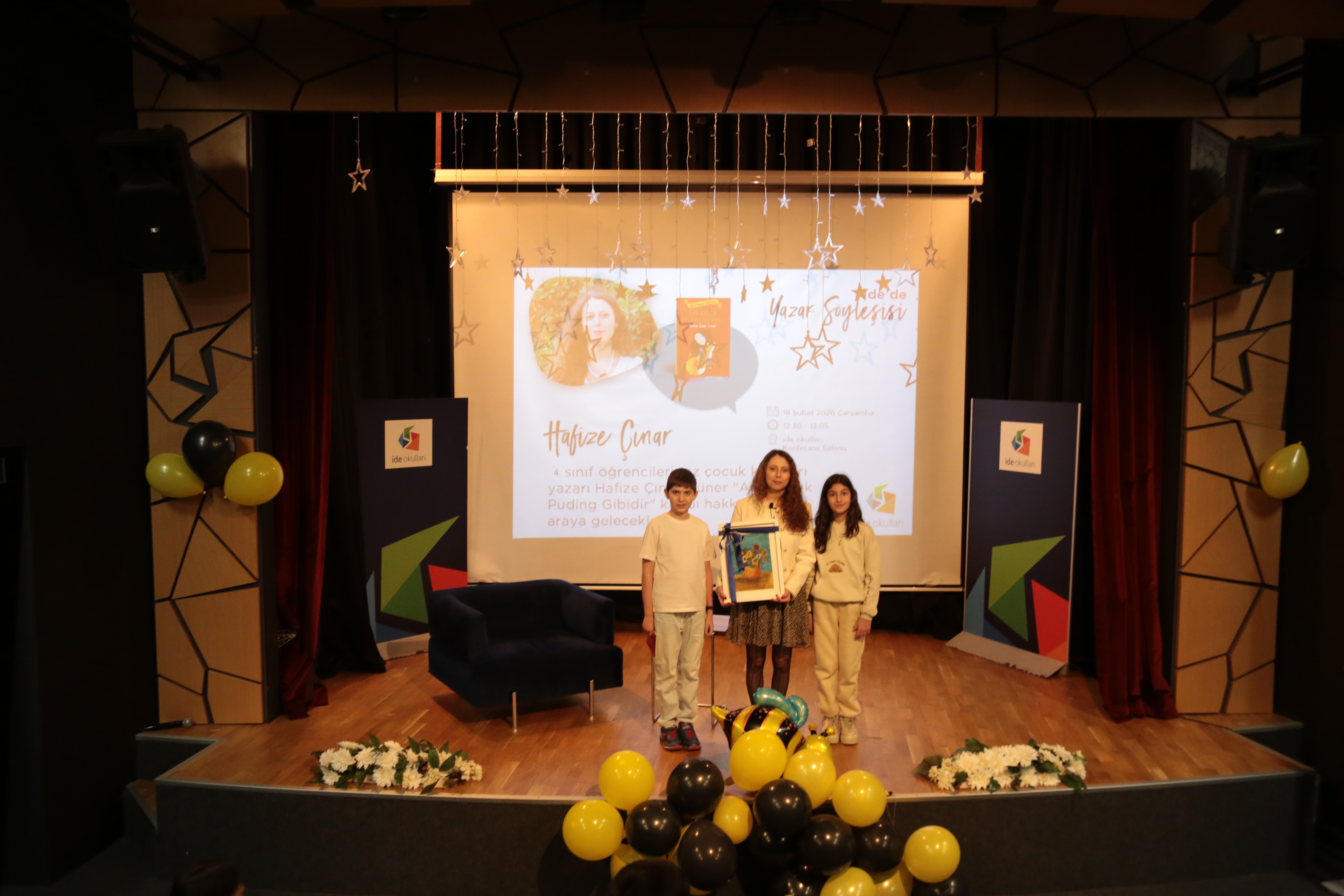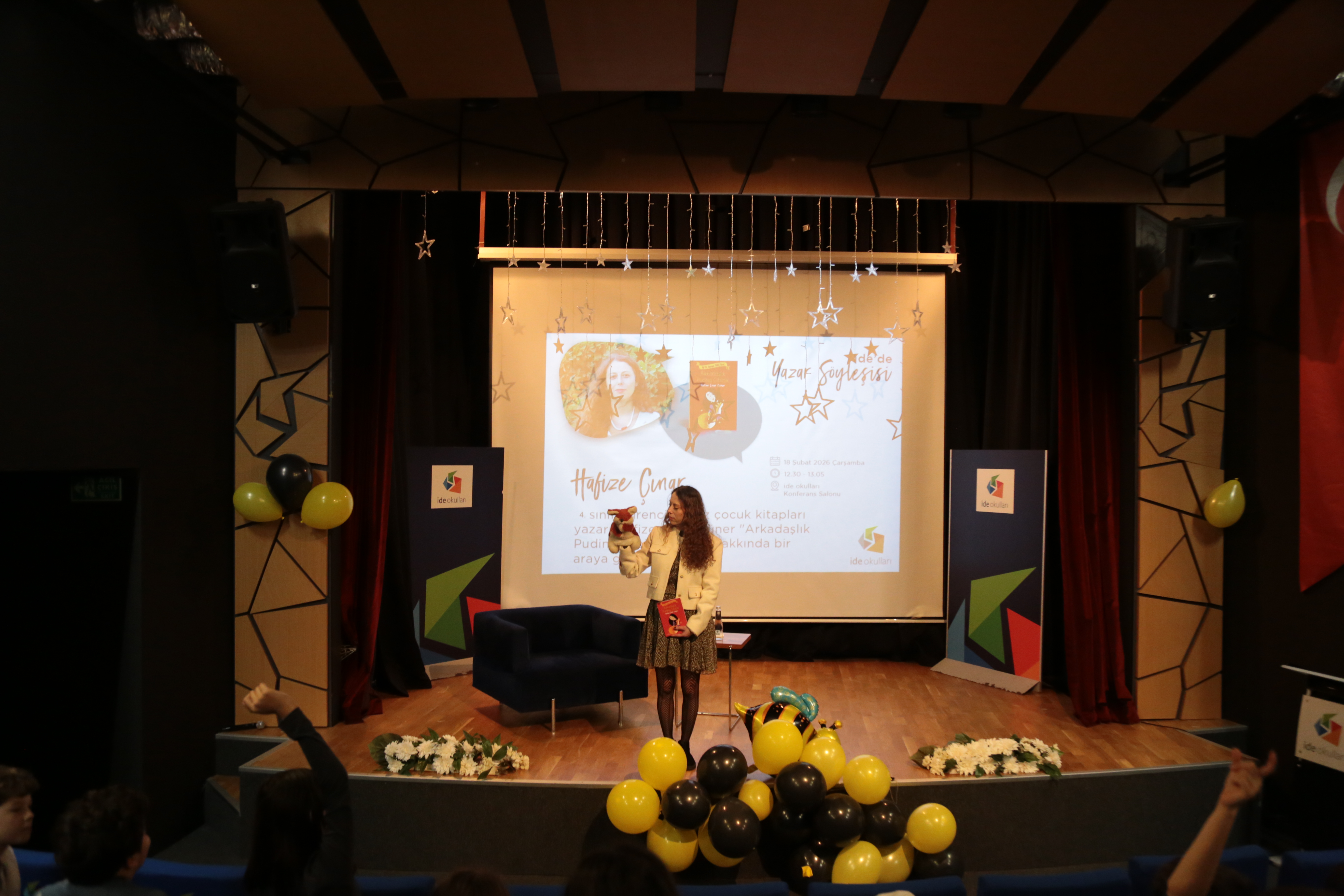 ide okulları 4. sınıf öğrencileri, “Arkadaşlık Puding Gibidir” kitabının yazarı Hafize Çınar ile gerçekleştirilen söyleşide bir araya gelerek edebiyat dolu keyifli bir buluşma yaşadı. Öğrenciler, okudukları kitap üzerine düşüncelerini paylaşma ve eserde kendilerinde iz bırakan bölümleri yazarla birlikte değerlendirme fırsatı buldu.