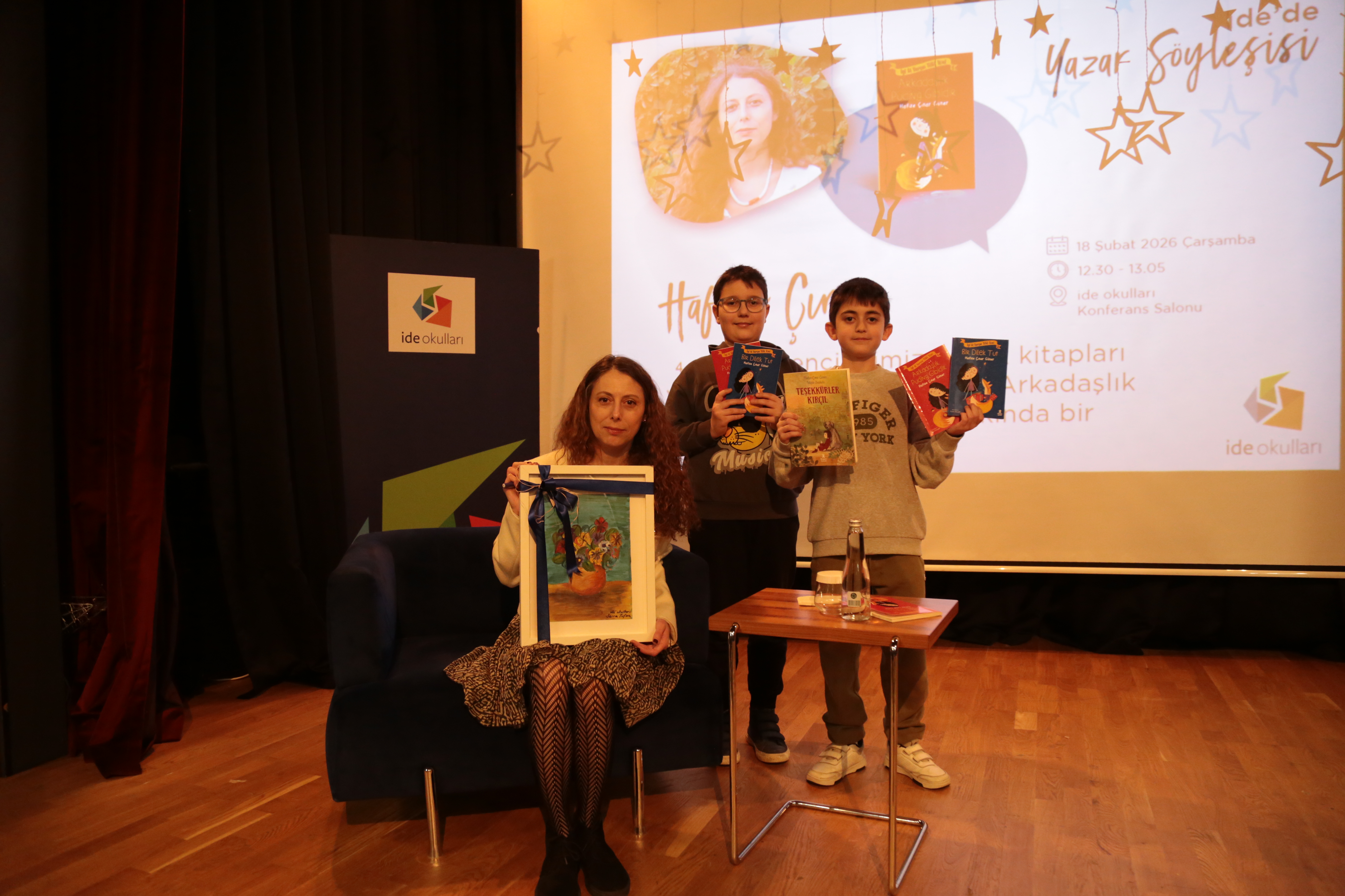 Programın sonunda öğrenciler, okudukları kitapları yazara imzalatma fırsatı bulurken edebiyat dünyasıyla doğrudan temas kurmanın heyecanını yaşadı. ide okulları olarak değerli katkılarından dolayı Hafize Çınar Güner’e teşekkür ediyor, öğrencilerimizin okuma yolculuğunu destekleyen bu tür kültürel buluşmaları önemsemeye devam ediyoruz.