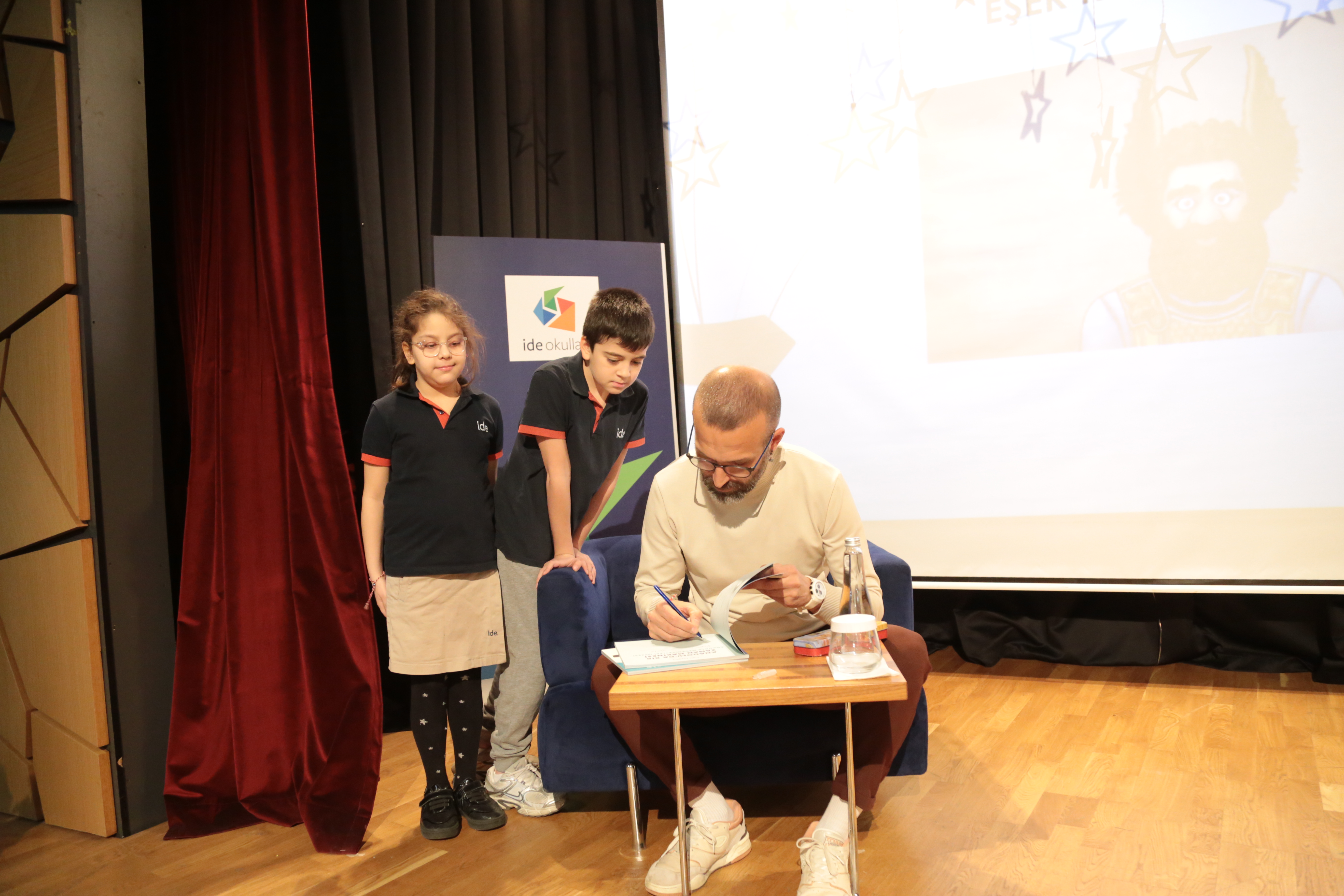 Öğrencilerimiz, merak ve heyecanla katıldıkları bu etkinlikte eserlerin yaratım süreçlerini öğrenirken kitaplara dair sorularını da yazarımıza iletebildiler. Söyleşinin ardından gerçekleştirilen imza etkinliği ise öğrencilerimiz için unutulmaz ve anlamlı anlar yaşanmasını sağladı. ide okulları olarak, katkıları ve kıymetli emekleri için Lider Hepgenç’e teşekkür ediyor, iyi ki aramızdaydınız diyoruz.